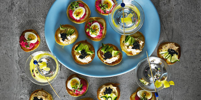 Bulat dan tipis, pancake kecil yang terkenal ini dapat dibuat dengan berbagai tepung, tetapi biasanya gandum. Mereka paling terkenal disajikan dengan kaviar hitam atau merah, atau di Rusia Anda dapat mencobanya dengan krim asam (smetana), selai atau susu kental.