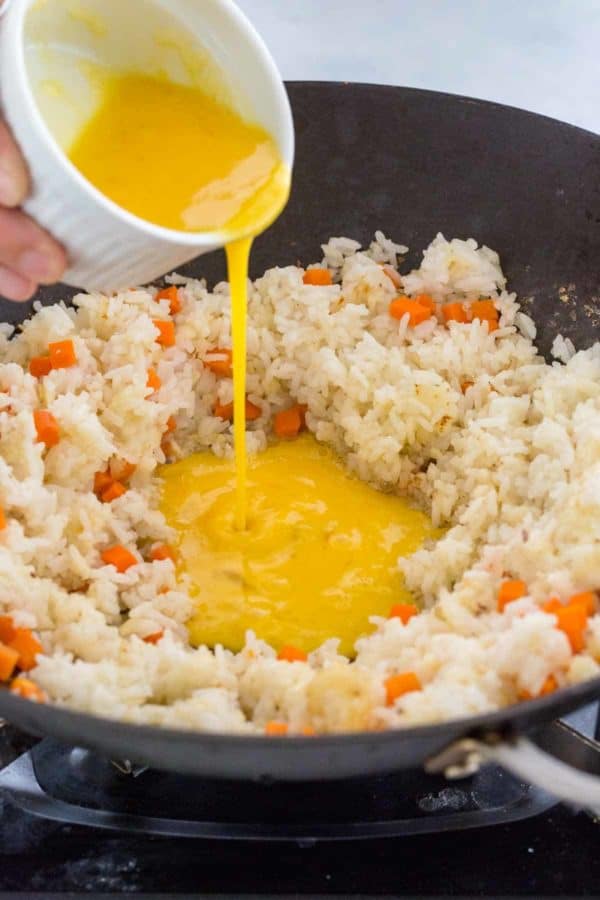 - Tuang dalam telur kocok, diamkan selama sekitar 30 detik, kemudian secara bertahap aduk untuk membuat potongan telur kecil, aduk hingga tercampur dengan nasi.