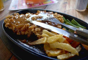 Bahan Utama: Dada Ayam (tanpa tulang), Telur (agak dikocok), pasta Jahe, pasta Bawang Putih, Bawang, Daun Ketumbar, Cabe Hijau, Bubuk Lada Hitam, Tepung (cukup untuk membuat lapisan tipis), Cuka, Garam, Minyak