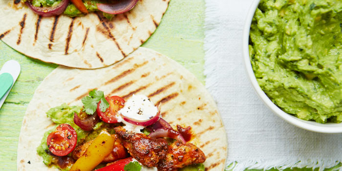 Guacamole dalam mangkuk dengan fajitas