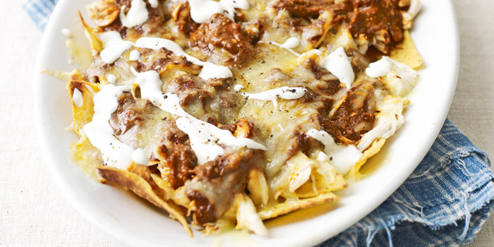 Hidangan sarapan tradisional yang populer ini menyajikan tortilla jagung goreng ringan yang dipotong menjadi empat bagian dan atasnya dengan salsa hijau atau merah (merah sedikit lebih pedas). Telur orak-arik atau goreng dan ayam yang ditarik biasanya ditambahkan di atasnya, serta keju dan krim. Chilaquiles sering disajikan dengan dosis sehat frijoles (kacang refried).