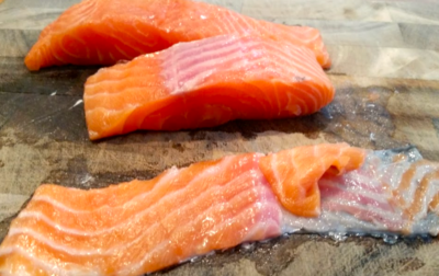Salmon adalah yang termudah. Saat membeli pastikan bahwa… .1. Ini super segar tanpa bau. 2. Bersih (padam kelembaban berlebih dengan handuk kertas kering). Jalankan pisau Anda di sepanjang bagian bawah ikan untuk menghilangkan kulit.