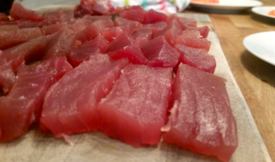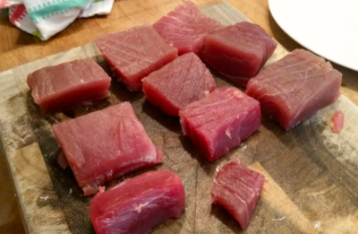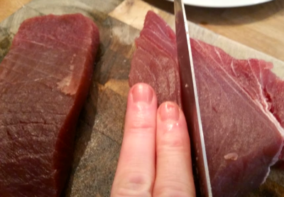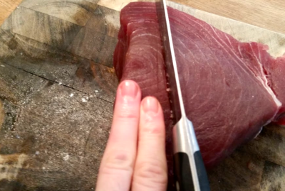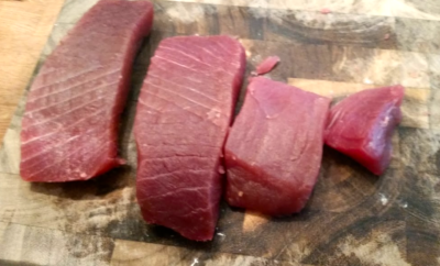 Sepotong besar tuna itu harganya 18 Euro dan itu ada di toko kelas atas. Mulailah dengan memotong potongan yang kira-kira 2 jari.