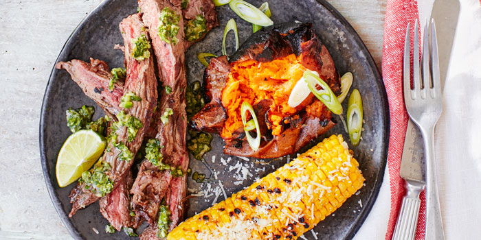 Steak dengan saus chimichurri, ubi dan jagung di piring